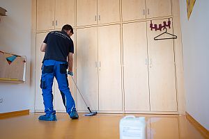 Zuerst kommt die Vorbereitung. Während Parkettböden geschliffen werden können, muss von Linoleum die alte Beschichtung entfernt werden. Dann wird der Boden gründlich gescheuert, also mit Wasser und Reinigungsmitteln gesäubert und hartnäckiger Schmutz entfernt. Die Überreste aus Schmutz, Wasser und Reinigungsmittel – die sogenannte Schmutzflotte – werden entfernt, damit der Boden trocknen kann.