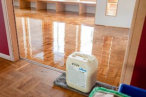 Ebenso entscheidend ist die Wahl der passenden Reinigungsmittel. Wir verwenden ausschließlich spezielle Parkettreiniger und verzichten bewusst auf aggressive Chemikalien. Gerade in sensiblen Bereichen wie Kitas ist es besonders wichtig, dass alle eingesetzten Produkte umweltverträglich und schadstofffrei sind.