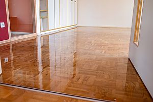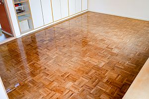 Überschüsse entfernen und Oberfläche veredeln, dann trocknen lassen. Der Parkett ist wie neu.